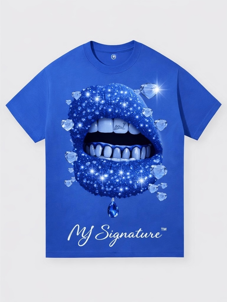 Make a boldhip-hop culturestatement with this vibrant cobalt blue t-shirt. It features an eye-catching graphic of shimmering, diamond-encrusted lips with a set of sparkling grills.