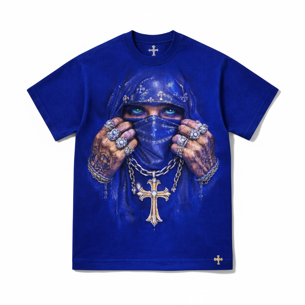 Elevate your streetwear rotation with this bold royal blue T-shirt featuring a powerful, hyper-detailed graphic. The design showcases piercing eyes framed by a jeweled veil, hands adorned with intricate tattoos and oversized rings, and a heavy chain finished with a striking gold cross pendant.